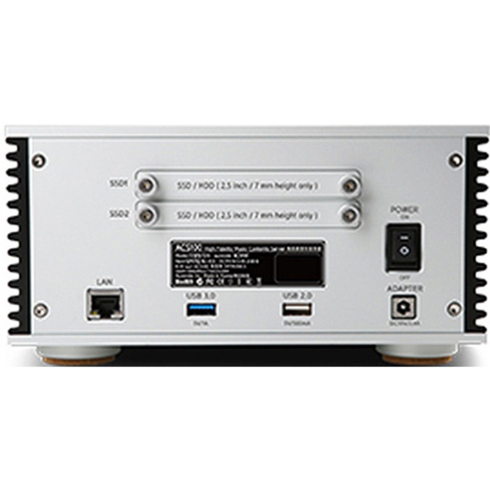 Выход USB Digital Audio Class 2.0 позволяет ACS100 работать в качестве аудиоплеера при подключении к внешнему ЦАП. Два порта USB 3.0 (по одному на передней и задней панелях) обеспечивают быструю передачу данных на установленные в ACS100 диски. Еще один USB 2.0, расположенный на задней панели, можно использовать для подключения USB-носителей или Acronova Nimbie AutoLoader(опционально — сторонний поставщик). Для подключения к роутеру предусмотрен изолированный порт LAN.