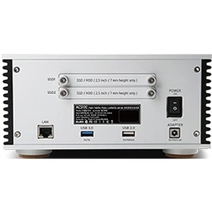 Выход USB Digital Audio Class 2.0 позволяет ACS100 работать в качестве аудиоплеера при подключении к внешнему ЦАП. Два порта USB 3.0 (по одному на передней и задней панелях) обеспечивают быструю передачу данных на установленные в ACS100 диски. Еще один USB 2.0, расположенный на задней панели, можно использовать для подключения USB-носителей или Acronova Nimbie AutoLoader(опционально — сторонний поставщик). Для подключения к роутеру предусмотрен изолированный порт LAN.