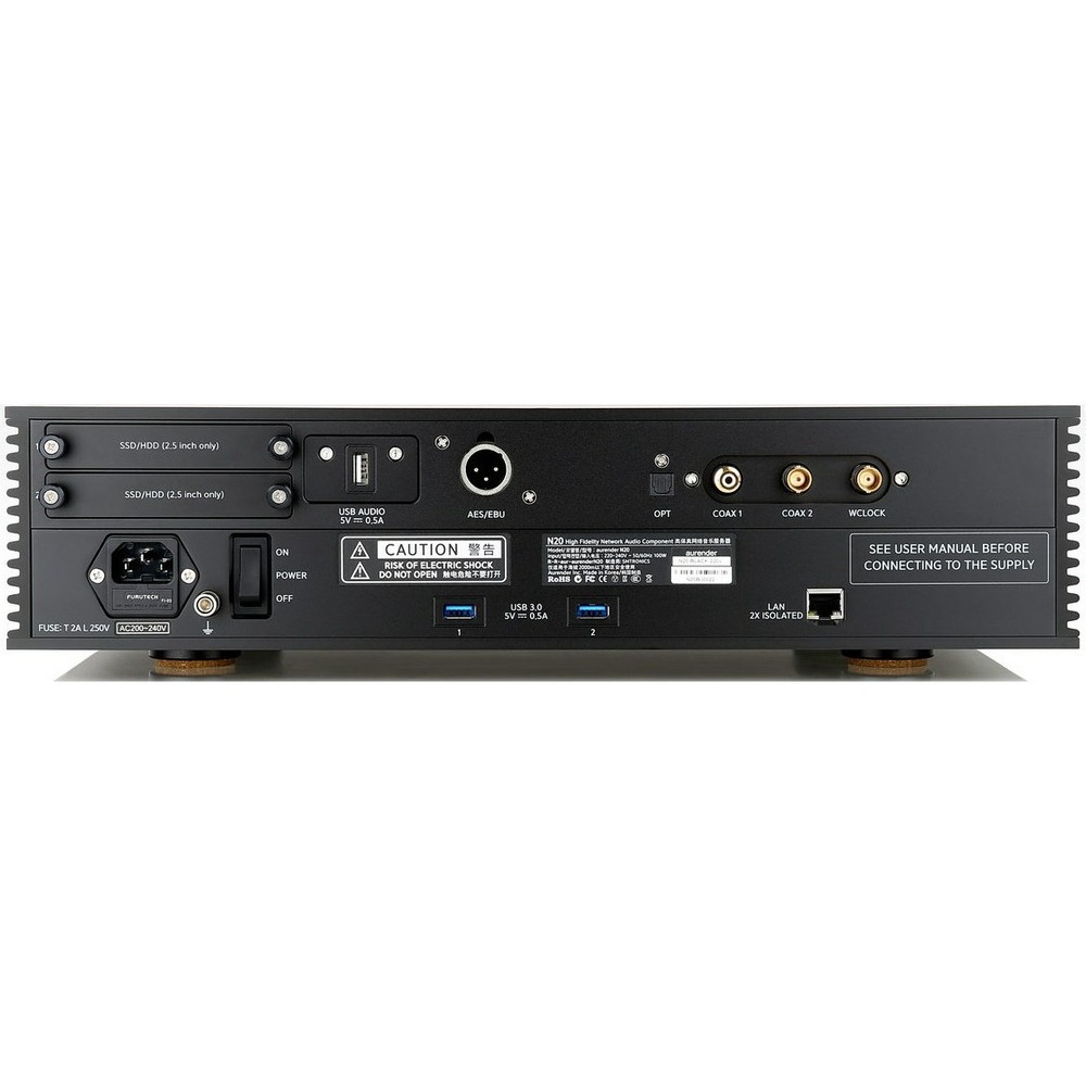 Предтоповый проигрыватель Aurender N20 4Tb, сочетающий в себе функции аудиофильского стримера и сервера, оборудован двумя слотами для 2,5-дюймовых дисков HDD и SSD. Суммарный объем такого хранилища может достигать 16 ТБ (при установке двух накопителей по 8 ТБ). В данной версии на борту имеется HDD объемом в 4 ТБ. Аппарат оснащается SSD-буфером на 500 ГБ для кэширования аудиофайлов перед воспроизведением, что позволяет увеличить срок службы HDD, уходящего в «спящий» режим сразу после передачи данных в кэш. При этом минимизируются шумы, связанные с работой жесткого диска.