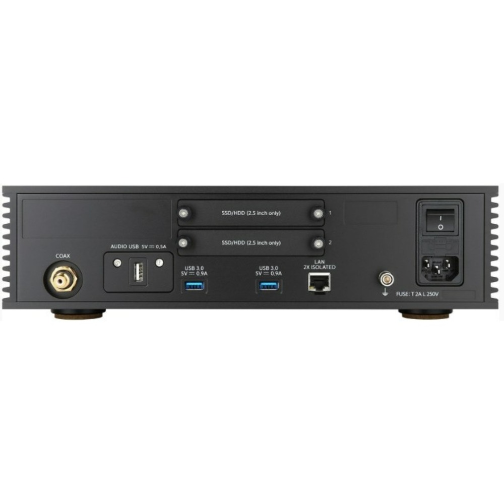 На тыльной панели Aurender N200 4Tb SSD помимо слотов для дисковых хранилищ имеется экранированный USB-выход с бесшумной схемой питания, предназначенный для передачи цифрового аудиосигнала на внешний ЦАП. Там же установлен высококачественный коаксиальный выход SPDIF. Также присутствуют два USB-порта для подключения внешних накопителей и гигабитный LAN-порт с двойной гальванической развязкой, предназначенный для получения аудиоконтента, хранящегося на компьютерах и NAS-серверах локальной сети.
