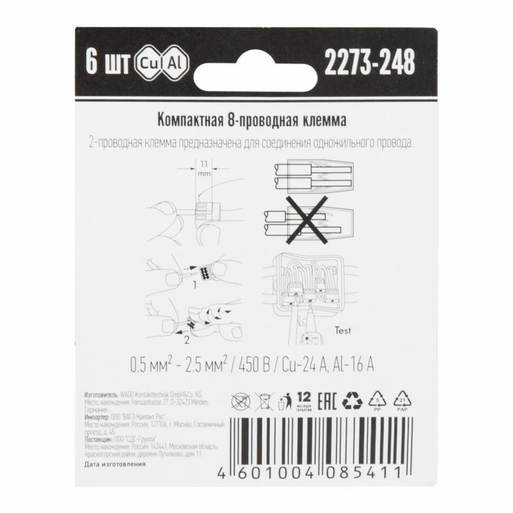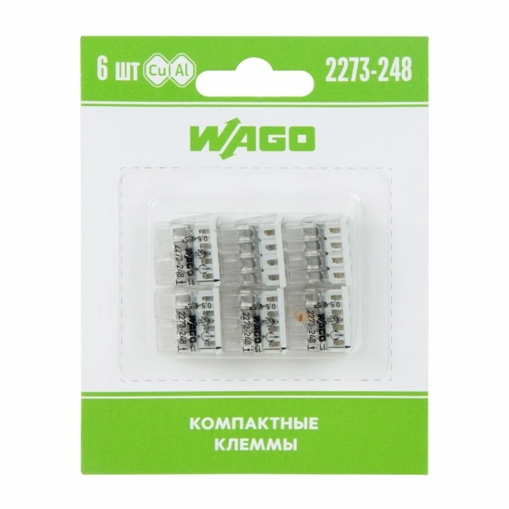 Электромонтажные экспресс-клемы WAGO 2273-248 позволят безопасно и быстро соединить 8 проводов между собой (алюминиевые и медные как одножильные, так и многожильные). Достаточно просто вставить жилу кабеля или провода в клемму и самозажимной контакт надежно зафиксирует соединение. Диаметр соединяемых проводов должен составлять в сечении от 0,5 до 2,5 мм2. Номинальный ток 24А; Номинальное напряжение 450В. Удобные тестовые гнезда, прозрачный корпус для визуального контроля и смотровое окно для проверки защиты от касаний делают работу более безопасной. Наличие пасты обеспечивает надёжную изоляцию контакта