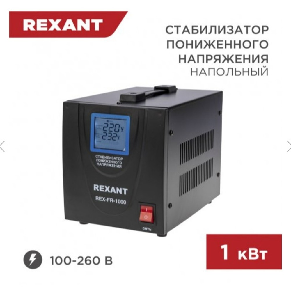 Однофазный стабилизатор переменного напряжения релейного типа марки REXANT используется для предотвращения поломки бытовых и промышленных электроприборов вследствие перепадов напряжения в сети.
