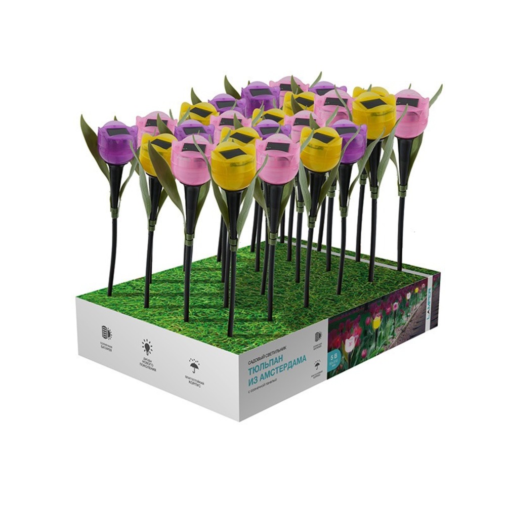 Садовый светильник LAMPER Тюльпан из Амстердама с солнечной панелью и аккумулятором оживляет любое пространство и создает неповторимую атмосферу уюта. Уникальный дизайн в виде тюльпана привнесет новые яркие акценты и украсит любое пространство своим оригинальным дизайном, а приятное белое свечение будет радовать долгое время благодаря прочной конструкции и долговечным диодам. Высокая степень IP защищает от замыкания при попадании влаги на устройство. Светильник LAMPER – идеальное устройство для декоративного уличного освещения, не требующее прокладки проводов и дополнительных элементов установки. Размеры: Ø 50х310 мм Тип диодов: LED Цвет свечения: белый Степень защиты: IP44 Материал корпуса: пластик Мощность: 2 Вт Напряжение: 5 В Время зарядки: 5 ч Время работы: 8 ч