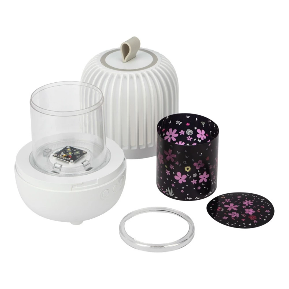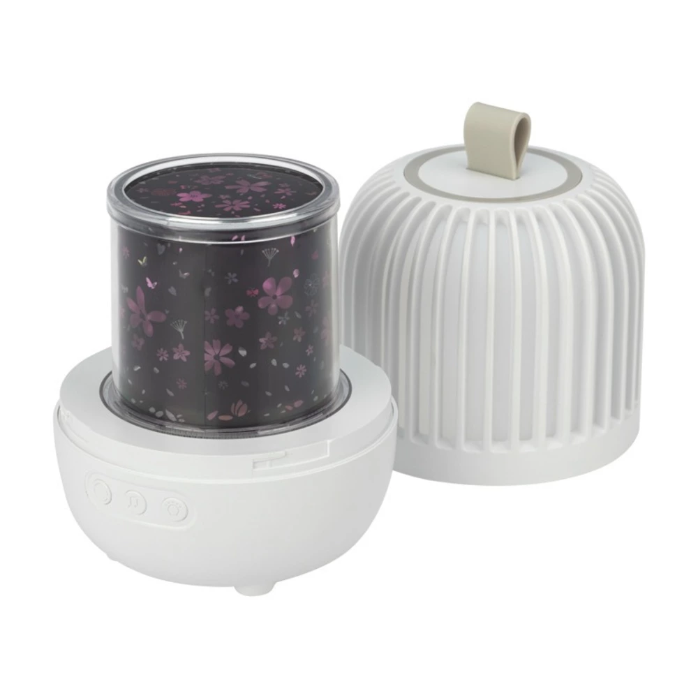 Светодиодный ночник-проектор с 3 сменными слайдами создает проекции с карточек на любые поверхности. Проектор оснащен вращающимся механизмом, который позволит наполнить комнату тематическими картинками: Вселенная/Морская/Цветущая вишня. С помощью такого проектора можно организовать увлекательную игру, которая непременно понравится детям или оформить интерьер световыми проекциями. Проектор имеет встроенный аккумулятор, время работы которого составляет от 3,5 до 24 часов. В комплекте есть USB-шнур для зарядки устройства.