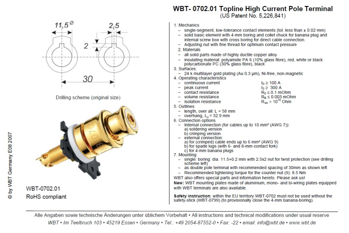 Тип: Акустический терминал. Материал: Чистая медь с золотым покрытием 24К. Производитель: Германия.