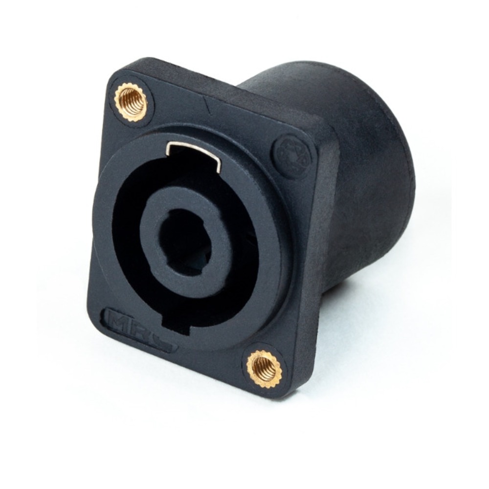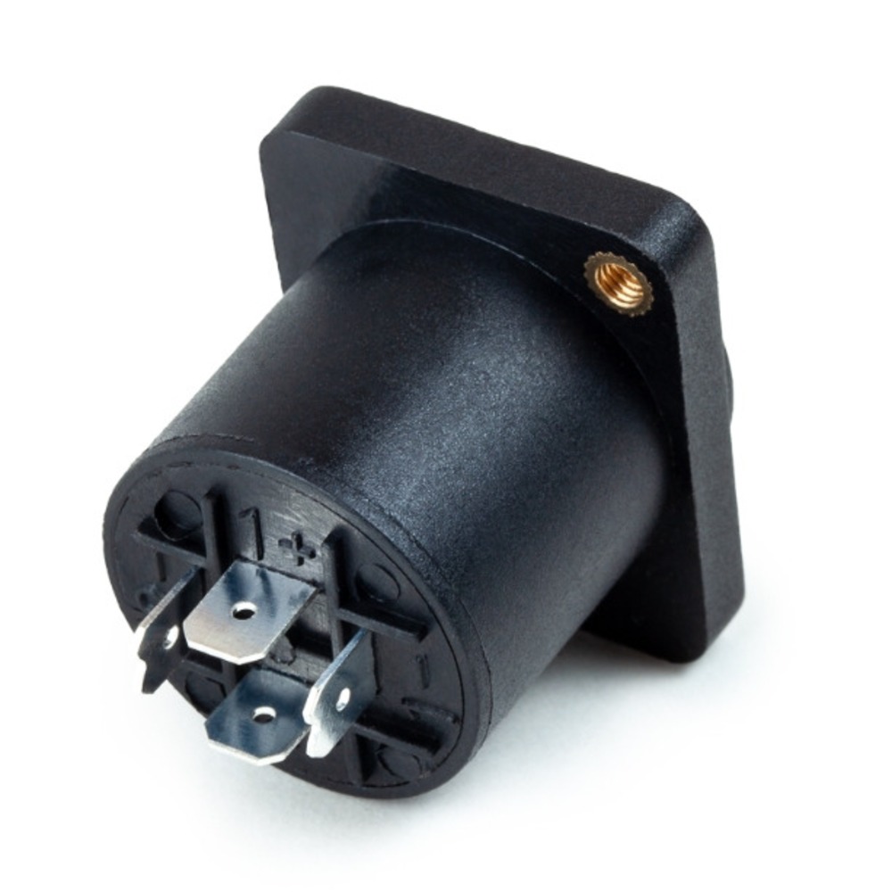 Панельный разъем SPEAKON для подключения громкоговорителей / усилителей, 4-х контактный <штекер/папа>, черный корпус из термопластика, фланец D-типа, резьбовая вставка M3, плоские контакты 3/16 ", надежная поворотная система блокировки, оптимизироавн для использования в динамиках, контакты - покрытие серебро, рабочее напряжение 250 В / ток 30 А, под пайку.