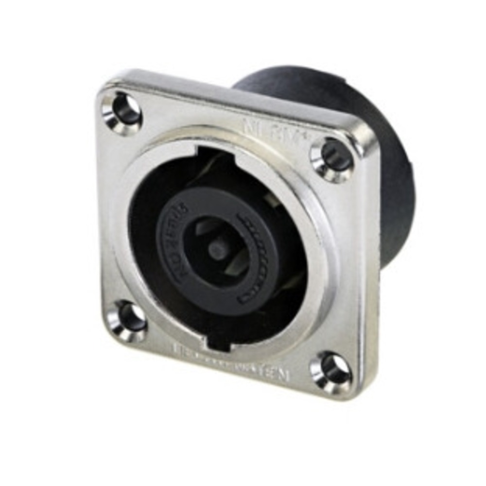 Панельный разъем SPEAKON для подключения громкоговорителей / усилителей, 8-и контактный <штекер/папа>, черный корпус из термопластика, квадратный металлический фланец G-типа, сквозные отверстия, плоские контакты 3/16 ", надежная поворотная система блокировки, оптимизироавн для использования в динамиках, контакты - покрытие серебро, рабочее напряжение 250 В / ток 40 А, под пайку