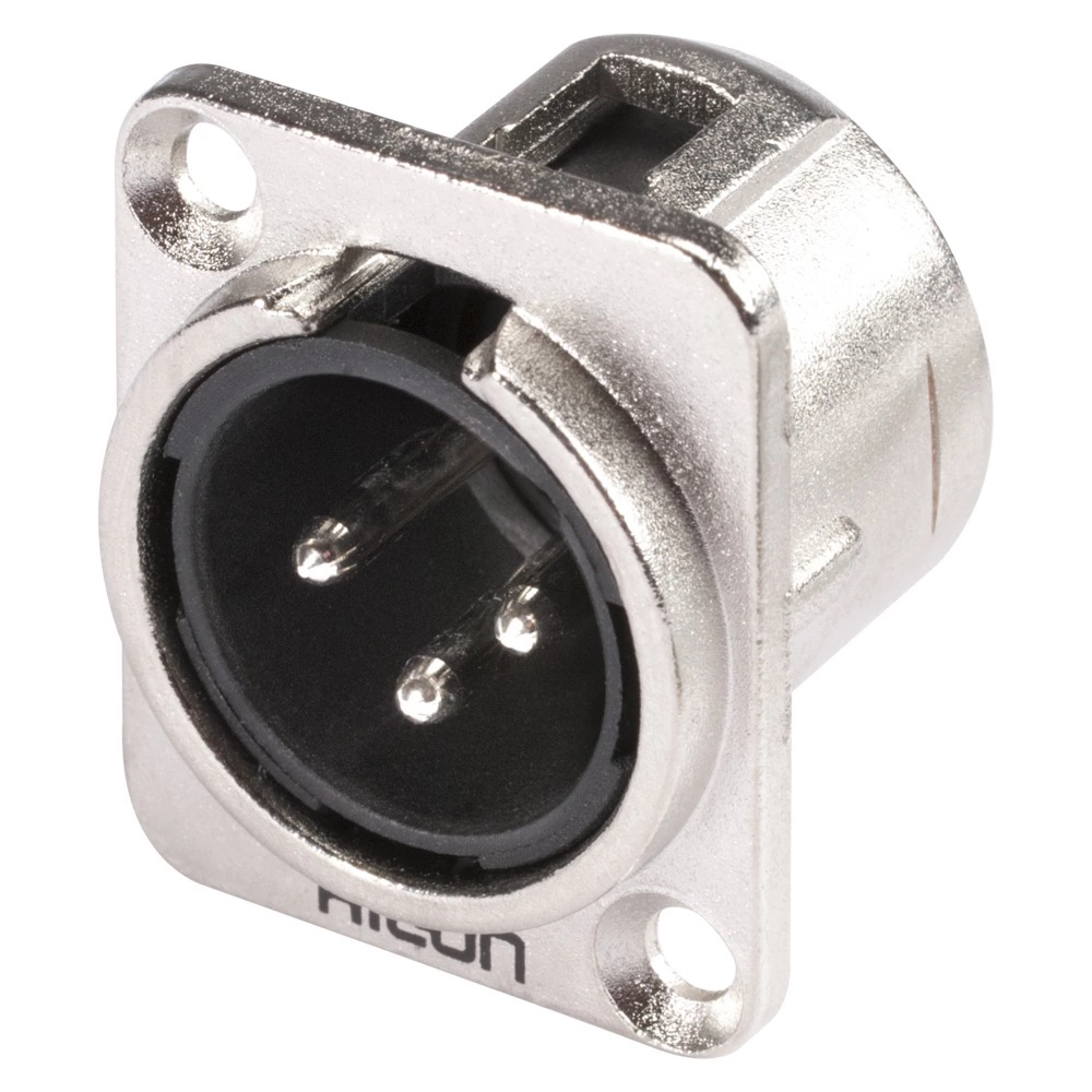 Разъем HICON XLR3, штекер на панель, никелированные контакты под пайку, количество контактов - 3, металлический никелированный корпус, фланец D-типа