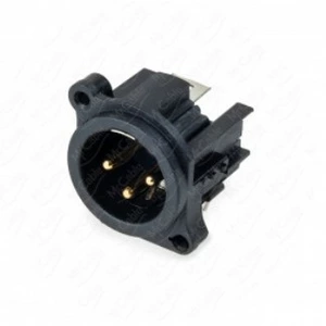 Тип Панельный разъем XLR, 3-х контактный <штекер/папа>, А-серия, фланец А-типа, горизонтальная установка PCB, компактный корпус из термопластика, заземление контакт 1 - на массу и на корпус ответного разъема, контакты - покрытие золото, под пайку.