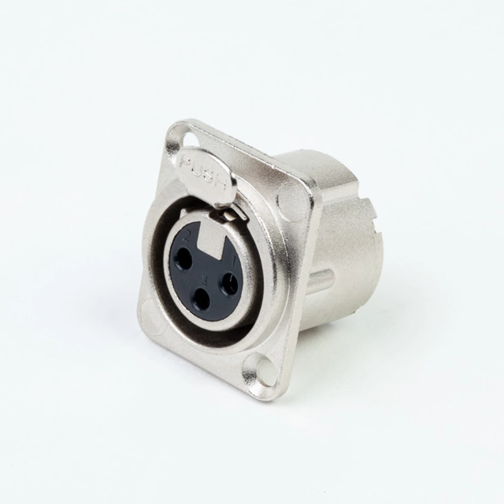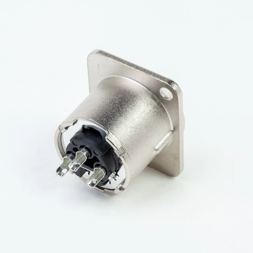 Тип Панельный разъем XLR, 3-х контактный <гнездо/мама>, А-серия, фланец D-типа, металлический никелированный корпус, контакты - покрытие серебро, под пайку