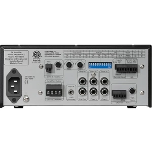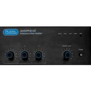 AA50PHD-CE – трехканальный усилитель-микшер. Диагностика подключения (PHD), раздельная регулировка чувствительности входов, общая регулировка (Master level), индикация состояния, удаленная селекция входов (RIS). Переключаемый балансный линейный/микрофонный вход (клеммная колодка), 3 небалансных линейных входа (RCA, 3,5 мм miniJack), фантомное питание 24 В. Выходная мощность 50 Вт RMS. Защита выхода от перегрузки и короткого замыкания.
