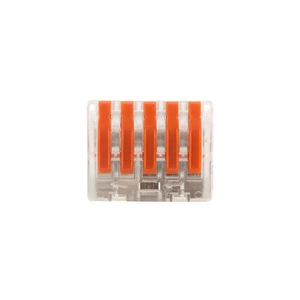 Соединительная многоразовая клемма REXANT на 5 проводников с плоско-пружинным зажимом предназначена для подсоединения медных одножильных и многожильных зачищенных проводников тонкого сечения. Перед монтажом с соединяемых проводников необходимо снять изоляцию в соответствии с обозначениями на корпусе клеммы (9-12 мм). Зачищенный участок с монтажной стороны не должен иметь сильных изгибов. Вставьте его в свободное гнездо клеммы, предварительно подняв оранжевый рычажок, после этого опустите рычажок в исходное положение. Контакт осуществляется путем зажима проводника пластиной. Конструкция предотвращает случайное размыкание контакта. Специальное технологическое отверстие на корпусе клеммы предназначено для проверки соединения тестером-пробником или щупом мультиметра. Оболочка из прозрачного пластика делает контакт изолированным, а также позволяет визуально оценить положение проводника. Извлечение проводника (демонтаж) осуществляется действиями в обратном порядке. Характеристики: Размер: 26,6x14.5x20.5 мм Материал: Полиамид 66 Количество контактов: 5 Материал контактов: луженая медь Зажим: сталь Цвет: прозрачный Напряжение: 400 В Материал подключаемых проводов: Cu Типы подключаемых проводов: одножильные, многожильные Ток: для одножильных проводов — 32 А, для многожильных проводов — 24 А\28-12 AWG Поддерживаемое сечение: 5x0.08-4 мм² (одножильный провод), 5x0.08-2.5 мм² (многожильный провод) Рабочая температура: –40...+85 ºC