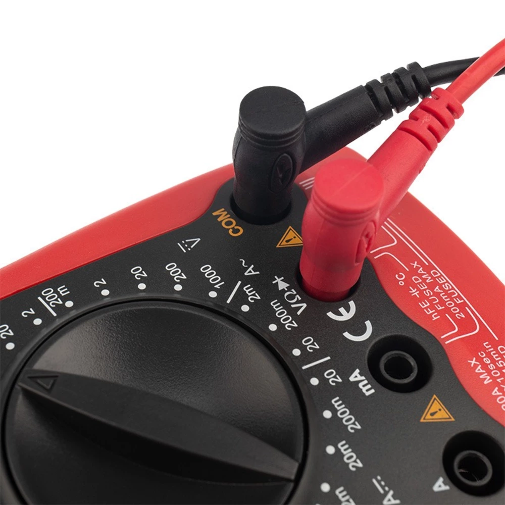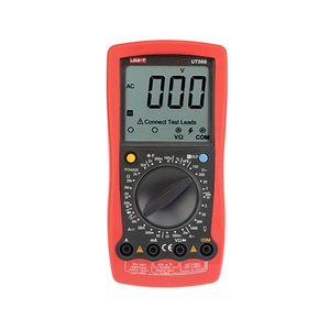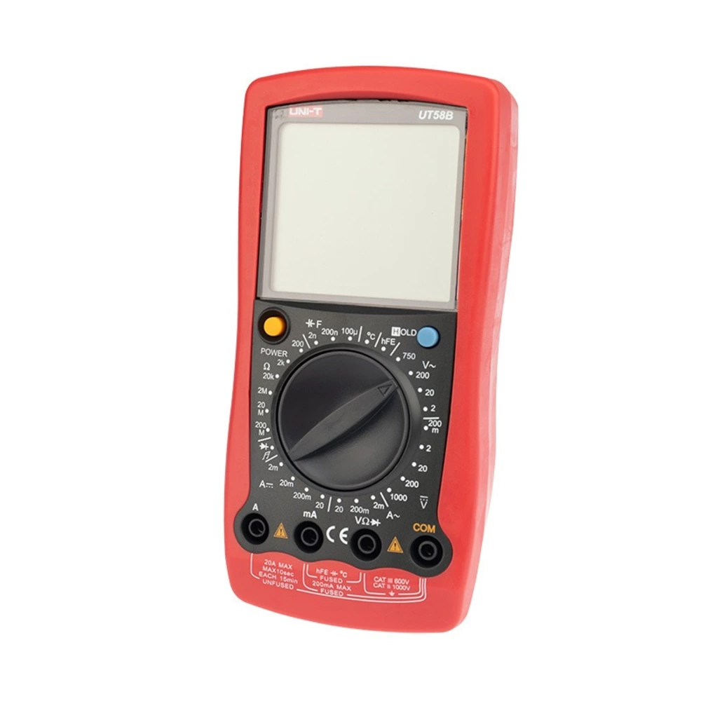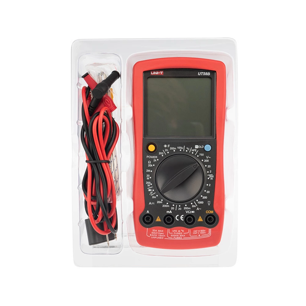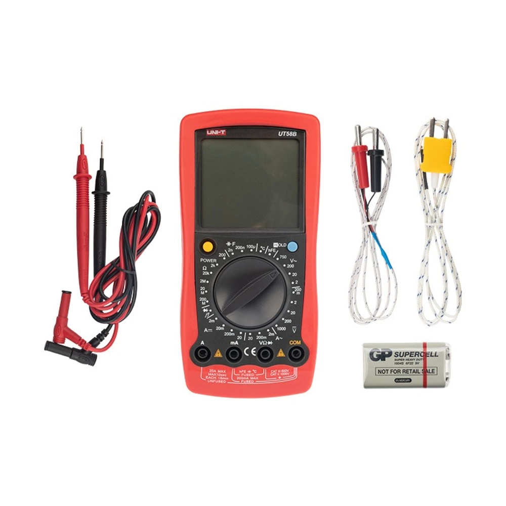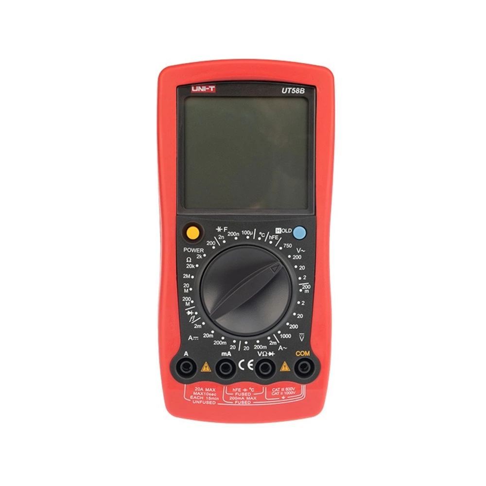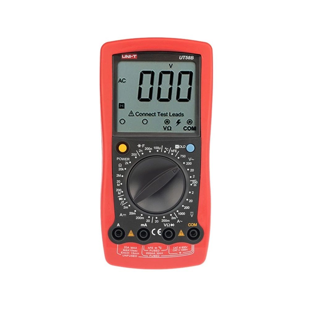 UT58B — это профессиональный мультиметр с современным и эргономичным дизайном. Предназначен прибор для измерений постоянного и переменного напряжения, сопротивления, постоянного и переменного тока. Кроме того, он имеет функции измерения электрической емкости и температуры, а также с его помощью вы сможете тестировать диоды и проводить прозвонку целостности цепи. Данный прибор обладает высоким классом точности показаний. Дисплей прибора оснащен подсветкой, которая позволяет проводить измерения даже в слабоосвещенных местах. Широкий функционал мультиметра UT50B позволяет обходиться без других вспомогательных устройств. Прибор оснащен функцией DATA HOLD, и зафиксировав результат измерений, вы в любое время сможете считать полученный значение. Прибор изготовлен из высококачественных материалов. Калибровка и тестирование приборов произведены под контролем компании СДС. Инженеры старались сделать прибор максимально удобным для использования, и сужение в нижней области корпуса позволяет удобнее располагать прибор в одной руке, а шероховатость корпуса предотвращает выскальзывание. Все переключения удобно производить даже одной рукой, но, несмотря на это, у прибора усиленный поворотный регулятор, благодаря которому исключается возможность случайного нажатия. Характеристики: Постоянное напряжение: 200 мВ/2 В/20 В/200 В/1000 В: ± (0. 5% + 1) Переменное напряжение: 2 В/20 В/200 В/750 В: ±(0.8%+3) Постоянный ток: 2 мА/20 мA/200 мА/20 А/20 А (0,8%+1) Переменный ток: 2 мА/200 мА/20А (1%+3) Сопротивление: 200 Oм/2 kOм/20 kOм/2 мOм/20 мOм/200 мOм (0,8%+1) Емкость: 2 нФ/200 нФ/100 мФ (4%+3) Температура: –40~+1000 °C Дисплей: 2000 Ручная установка диапазона измерений Тестирование диодов Автовыключение Режим удержания измерений DATA HOLD Прозвонка целостности цепи Индикатор разряда батареи Импеданс: около 10 МОм Размер: 179х88х39 мм Тип батареи: 9 В батарея Комплект поставки: тестер, чехол, щупы, инструкция, батарея, термопара тип К