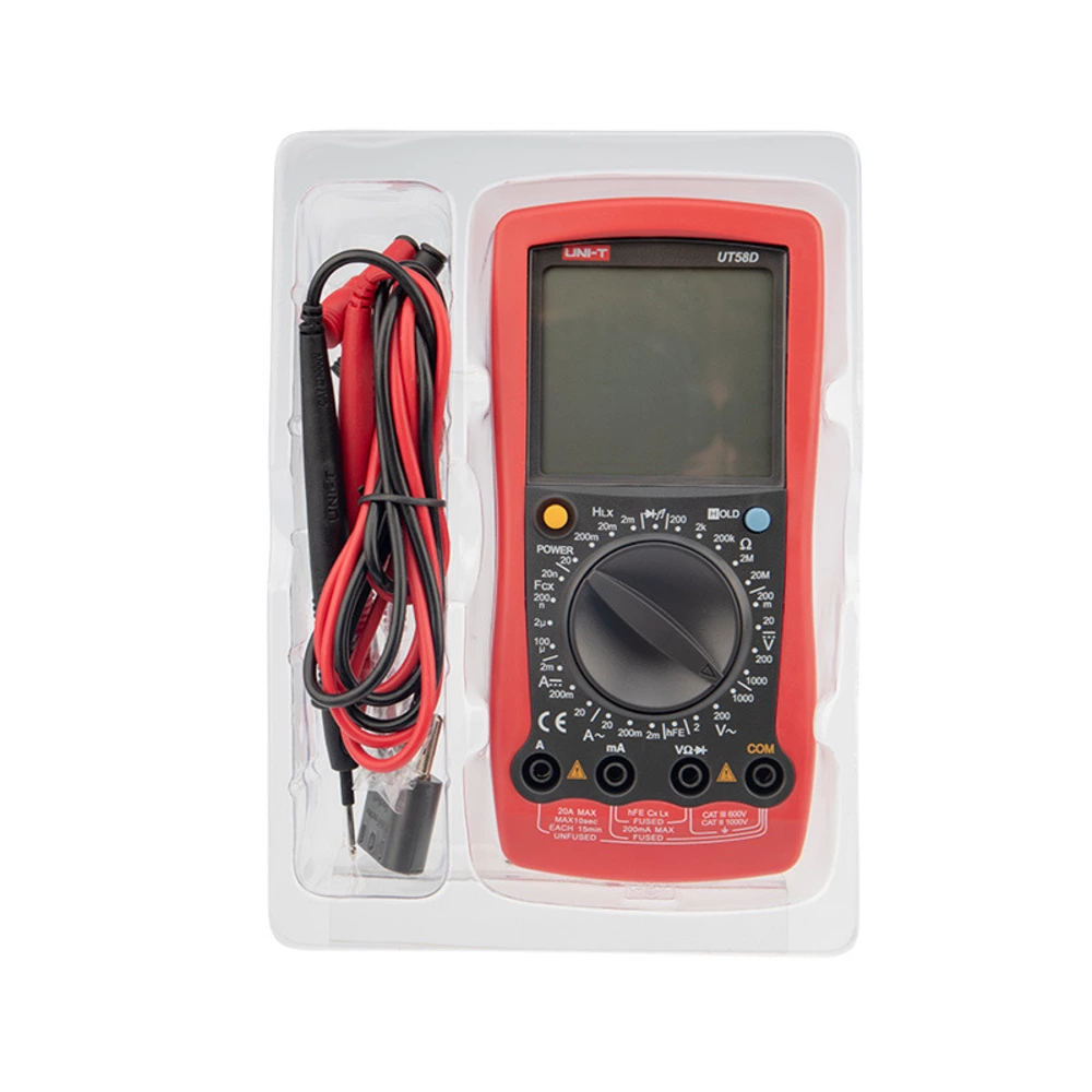 UT58D — это профессиональный мультиметр с современным и эргономичным дизайном. Предназначен прибор для измерений постоянного и переменного напряжения, сопротивления, постоянного и переменного тока. Кроме того, он имеет функцию измерения электрической емкости, а также с его помощью вы сможете тестировать диоды и проводить прозвонку целостности цепи. Мультиметр 58D может измерять индуктивность до 20 генри, что не часто можно встретить в этом классе мультиметров. Данный прибор обладает высоким классом точности показаний. Дисплей прибора оснащен подсветкой, которая позволяет проводить измерения даже в слабоосвещенных местах. Широкий функционал мультиметра UT58D позволяет обходиться без других вспомогательных устройств. Прибор оснащен функцией DATA HOLD, и зафиксировав результат измерений, вы в любое время сможете считать полученный значение. Прибор изготовлен из высококачественных материалов. Калибровка и тестирование приборов произведены под контролем компании СДС. Инженеры старались сделать прибор максимально удобным для использования, и сужение в нижней области корпуса позволяет удобнее располагать прибор в одной руке, а шероховатость корпуса предотвращает выскальзывание. Все переключения удобно производить даже одной рукой, но, несмотря на это, у прибора усиленный поворотный регулятор, благодаря которому исключается возможность случайного нажатия. Характеристики: Постоянное напряжение: 200 мВ/20 В/200 В/1000 В: ± (0. 5% + 1) Переменное напряжение: 2 В/200 В/1000 В: ±(0.8%+3) Постоянный ток: 2 мА/20 мA/20 А (0,8%+1) Переменный ток: 2 мА/20 мA/20 А (1%+3) Сопротивление: 200 Oм/2 kOм/20 kOм/2 мOм/20 мOм (0,8%+1) Емкость: 20 нФ/200 нФ/2 мФ/100 мФ ± (2. 5% + 5) Индуктивность: 2 мГ/20 мГ/200 мГ/20 Г ±(2%+10) Дисплей: 2000 Ручная установка диапазона измерений Тестирование диодов Автовыключение Режим удержания измерений DATA HOLD Прозвонка целостности цепи Индикатор разряда батареи Импеданс: около 10 МОм Размер: 179х88х39 мм Тип батареи: 9 В батарея Комплект поставки: тестер, чехол, щупы, инструкция, батарея, щупы с зажимами типа крокодил