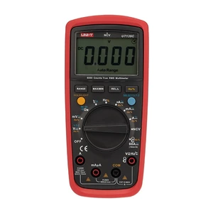 Универсальный мультиметр UNI-T UT139C с современным дизайном, большим дисплеем, подходит для измерения напряжения, силы тока, сопротивления, емкости, частоты и температуры. Обладает высоким классом точности. Имеет режим измерения среднеквадратичных значений TRUE RMS, бесконтактный детектер напряжения NCV. Дисплей с подсветкой облегчает работу в слабоосвещенных местах. Благодаря удобному регулятору все переключения можно производить даже одной рукой. Выбор диапазона измерения производится автоматически или вручную. Модель имеет режим измерения токов до 60 А при подключении внешних токовых клещей. Технические характеристики UNI-T UT139C: • Тип отображения: цифровой • Постоянное напряжение: 0.06, 6, 60, 600 ±(0.7%+3) В • Переменное напряжение: 6, 60, 600 ±(1.0%+3) В • Постоянный ток: 0.0006, 0.006, 0.06, 0.6, 6, 10 ±(0.8%+2) А • Переменный ток: 0.0006, 0.006, 0.06, 0.6, 6, 10 ±(1.0%+3) А • Сопротивление: 0.0006, 0.006, 0.06, 0.6, 6, 60 ±(1.0%+2) Мом • Емкость: 1 пФ - 99 999 мкФ ±(4.0%+5) • Температура: -40...+1000 °С ±(1.0%+3) •Скважность (коэффициент заполнения): 1-99% • Диапазон частот по переменному току: 10-10000000 ±(0.1%+4) Гц • Проверка батарей: нет • Подсветка дисплея: да • Разрядность: 6000 отсчетов • Количество измерений в секунду, раз: 3 • Диод-тест: да • Защитный холстер: да • Индикация разряда батареи: да • Индикация перегрузки: да • Сохранение показаний DATA HOLD: да • Прозвонка межсоединений со звуковым сигналом: да • Рабочая температура: 0...+40 °С • Коэффициент заполнения: 0.1~99.9% • Питание: 2х1,5 В АА • Размер: 175х80х48.5 мм • Вес: 0.35 кг Комплектация: мультиметр, измерительные щупы, термопара тип К, инструкция, упаковка. Преимущества: • Высокая точность измерений; • Индикация разряда батареи; • Возможность измерять токи до 60 A (с внешими клещами); • Сохранение показаний DATA HOLD; • Индикация режима измерения на дисплее; • Измерение истинных среднеквадратических значений (TRUE RMS); • Режим относительных измерений и измерения минимальных/максимальных значений; • Наличие бесконтактного детектера напряжения NCV.