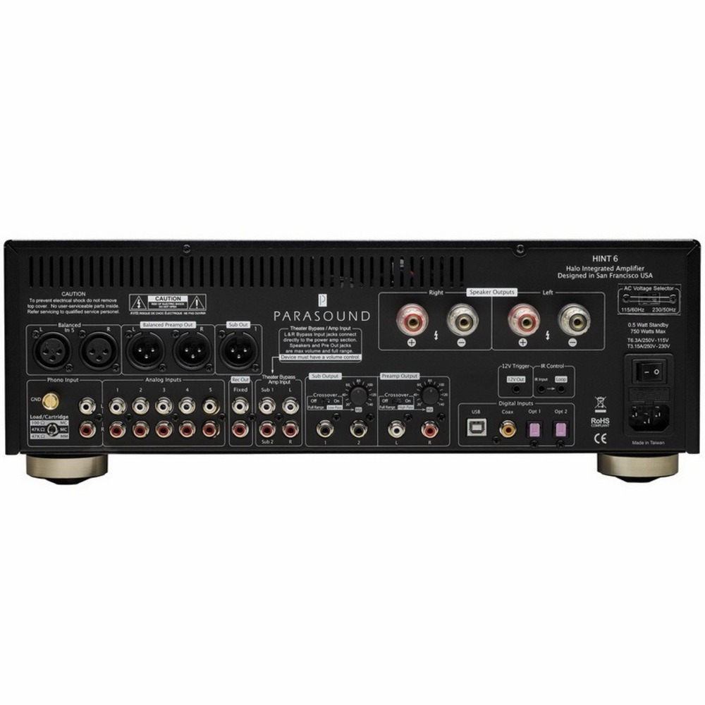 В отличие от оригинального Halo, использующего моторизованный потенциометр в роли регулятора громкости, в Parasound HINT 6 установлен лестничный Burr-Brown с электронным управлением. Такое решение, как утверждают разработчики, позволило добиться более контролируемой сцены за счет увеличения динамического диапазона, снижения уровня шума и улучшения разделения каналов. Сам регулятор — тяжелый, алюминиевый, вращается на шарикоподшипниках. Сбоку расположен дисплей с отключаемой подсветкой, на котором отображен уровень громкости (от 0 до 99 пунктов). Пользователь может с помощью идущего в комплекте пульта установить стандартное значение уровня громкости при включении усилителя и любимое значение громкости.