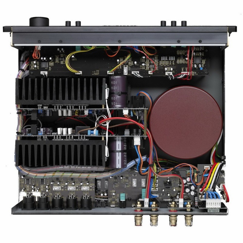 В предварительной секции имеется отключаемый темброблок по НЧ и ВЧ – дань хай-файной классике. Оконечные усилители класса AB, но с несколько необычной архитектурой – в них драйверы на полевых транзисторах MOSFET раскачивают мощные выходные биполяры, по три штуки в плече. Работая с 8-омной акустикой, Hint выдаёт до 2 х 160 Вт, а с 4-омной — до 2 х 240 при искажениях не выше 0,05%.