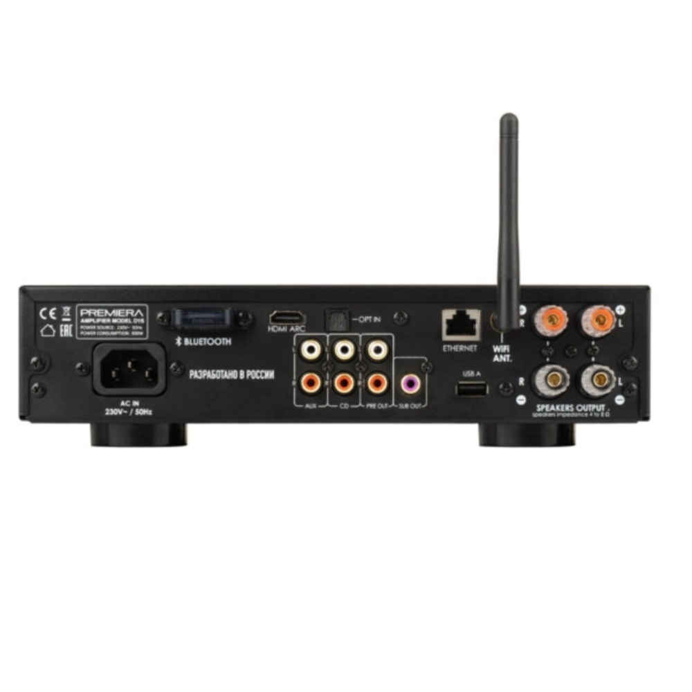 Premiera D1S – современный интегральный Hi-Fi стереоусилитель класса D со встроенными сетевым проигрывателем, ЦАП, Bluetooth, HDMI ARC, Wi-Fi, AirPlay 2 и с номинальной выходной мощностью 101 Вт на канал (4 Ом) при искажениях менее 0,08%.