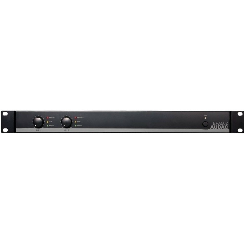 EPA502 – двухканальный усилитель мощности класса D. Выходная мощность 2х500 Вт/4 Ом, 2х300 Вт/8 Ом, 1х1000 Вт/8 Ом. Переход в режим ожидания при отсутствии сигнала. Защита от короткого замыкания, перегрева, перегрузки, ограничение выходного сигнала. Режимы работы: мостовой/ стерео/ параллельный. Входы: 2х XLR (розетка) с проходными выходами на разъемах XLR (вилка). Стальной корпус высотой 1U в рэковом исполнении.