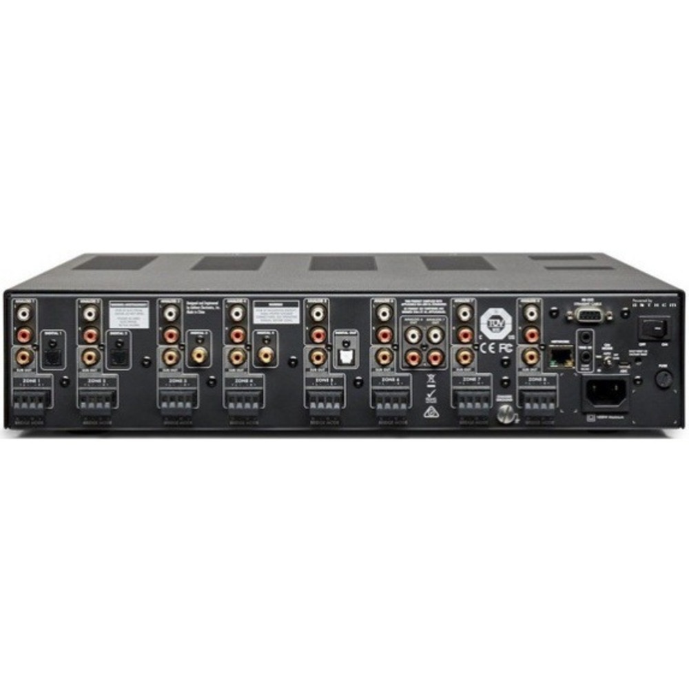 Устройства готовы работать с цифровыми сигналами вплоть до 24 бит/192 кГц. На каждую зону мультирум приходится стереоусилитель класса D с мощностью 2 х 60 Вт на нагрузке 8 Ом, которая удваивается на нагрузке 4 Ом. Кроме того, предусмотрено мостовое соединение выходов усилителей каждой зоны — тогда можно получить 200 Вт на 8 Ом в моноварианте.