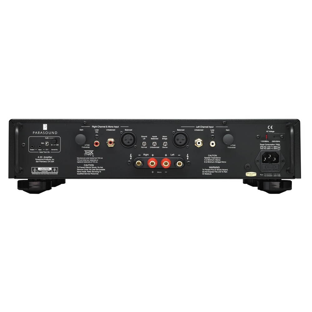 Модель Parasound Halo A23+ также получила новый трансформатор мощностью 1,1 кВА и набор конденсаторов емкостью 54 400 мкФ. Теперь максимальная мощность усилителя в мостовом режиме достигает 500 Ватт. Как и старшая модель, A23+ оборудована симметричными и несимметричными входными терминалами с регулировкой чувствительности для лучшего согласования с предварительным усилителем. Весит Parasound Halo A23+ 12,2 килограмма.