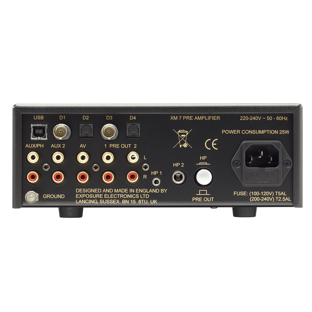Серия XM является первой из серий Exposure, которая способна вмещать полный набор функций в компактную конструкцию с половинной от стандартной шириной. Стартом серии был фонокорректор XM3 и интегрированный усилитель XM5. Новый предусилитель XM7 практично вмещает обширный набор функций в свой компактный качественный корпус. В их список входят усилительный фонокаскад для MM картриджа и ЦАП, обеспечивающие как виниловое, так и цифровое блаженство. ЦАП имеет пять цифровых входов, а также есть аналоговый вход для домашнего кинотеатра с фиксированным усилением и два выхода для наушников. Два выхода предусилителя позволяют использовать схему би-ампинг (например в связке с парой XM9).