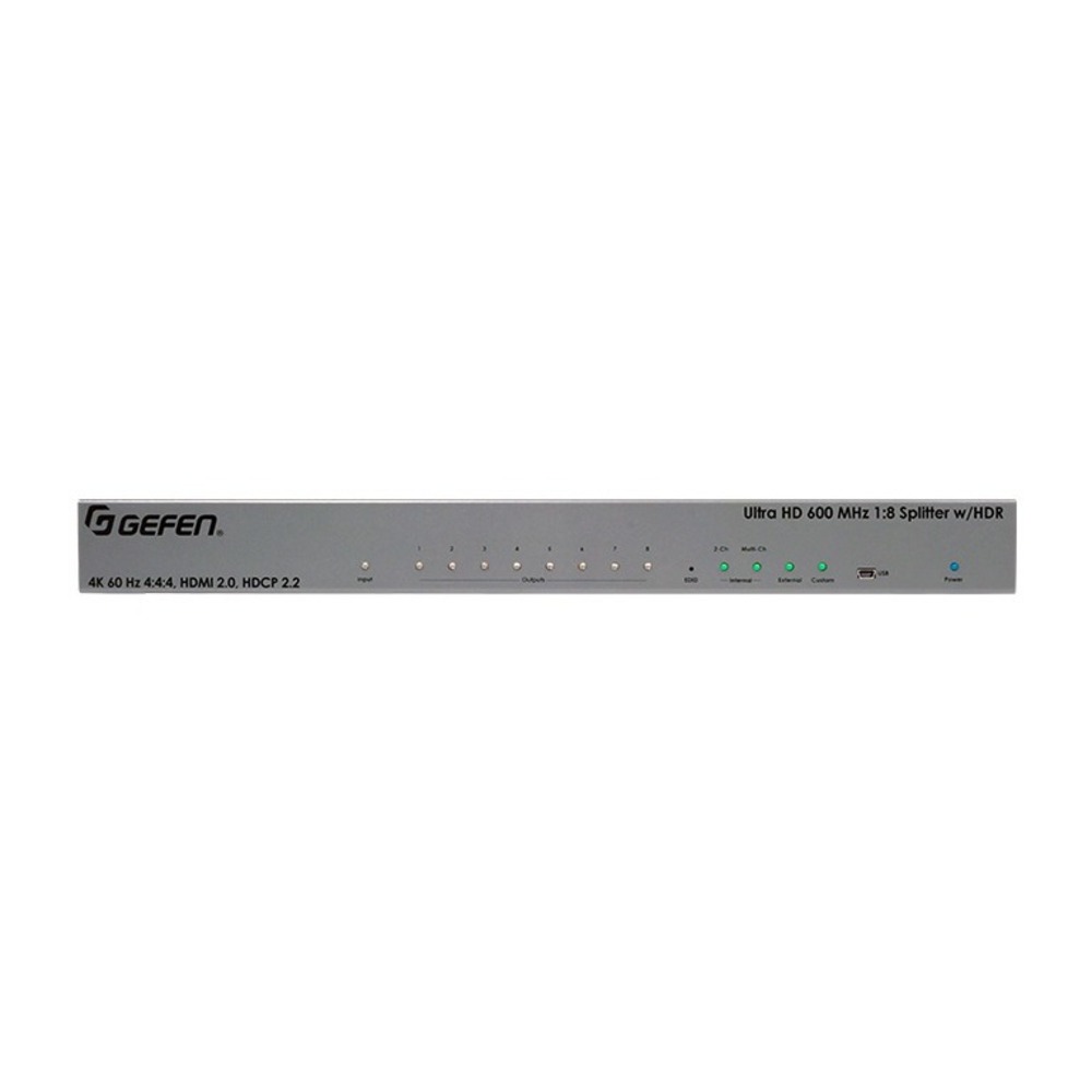 EXT-UHD600-18 – усилитель-распределитель 1:8 сигналов интерфейса HDMI с HDCP 1.4 или 2.2 разрешения 4Kх2K, 3D с HDR. Поддерживаются сигналы разрешением до 3840x2160/60, 4096x2160/60 с цветовым пространством YUV 4:4:4 и Deep Color 10 бит, сигналы 1080p с Deep Color 12 бит. Полоса пропускания 600 МГц. Десятиуровневое каскадирование без HDR, с HDR – шестиуровневое. Поддерживаются кодеки многоканального встроенного аудио LPCM 7.1, Dolby Atmos, Dolby TrueHD, DTS:X и DTS-HD Master Audio до 192 кГц. Выходные порты HDMI с LRP (5 В, 500 мА). Совместим с ПО Gefen Syner-G.