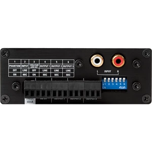 - DIP-переключатели (6 направлений), которые позволяют выбрать микрофонный или линейный уровни для входа и трех выходов, а также на входе подключить или отключить фантомное питание микрофона и заграждающий фильтр низких частот