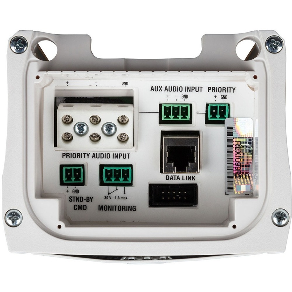 Разъемы подключения находятся на панели в нижней части колонны и защищены специальным пластиковым экраном. Источники звука могут быть подключены независимо через два балансных входа Priority и Aux. Разъем Priority оснащен керамическими клеммами с тепловым предохранителем для безотказной работы системы тревожного оповещения. Порт Data Link позволяет осуществлять контроль и мониторинг с помощью ПО RDNet, порт Monitoring — для удаленного отслеживания неисправностей.