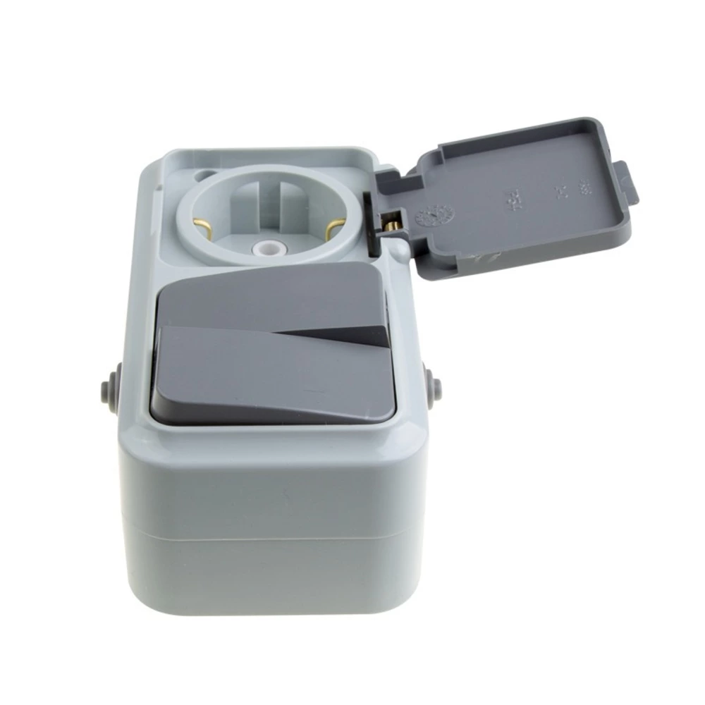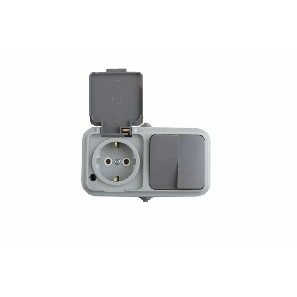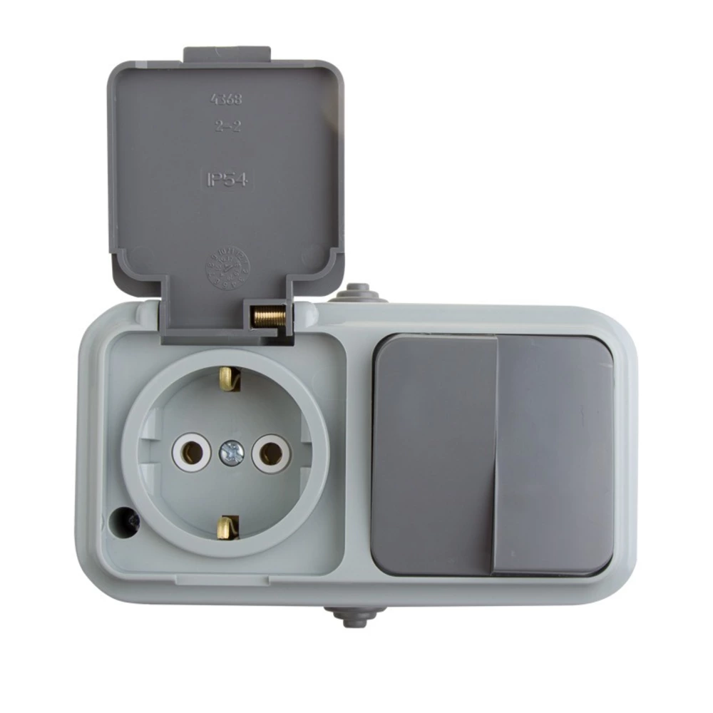Выключатель двухклавишный + розетка влагозащищенная для открытой установки REXANT IP54, выключатель 10 А, розетка с/з 16 А, В-РЦ-659(03) Rexant 78-0530