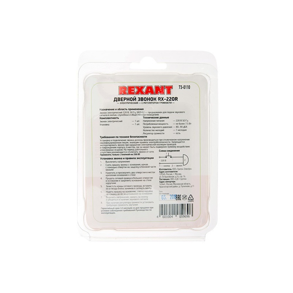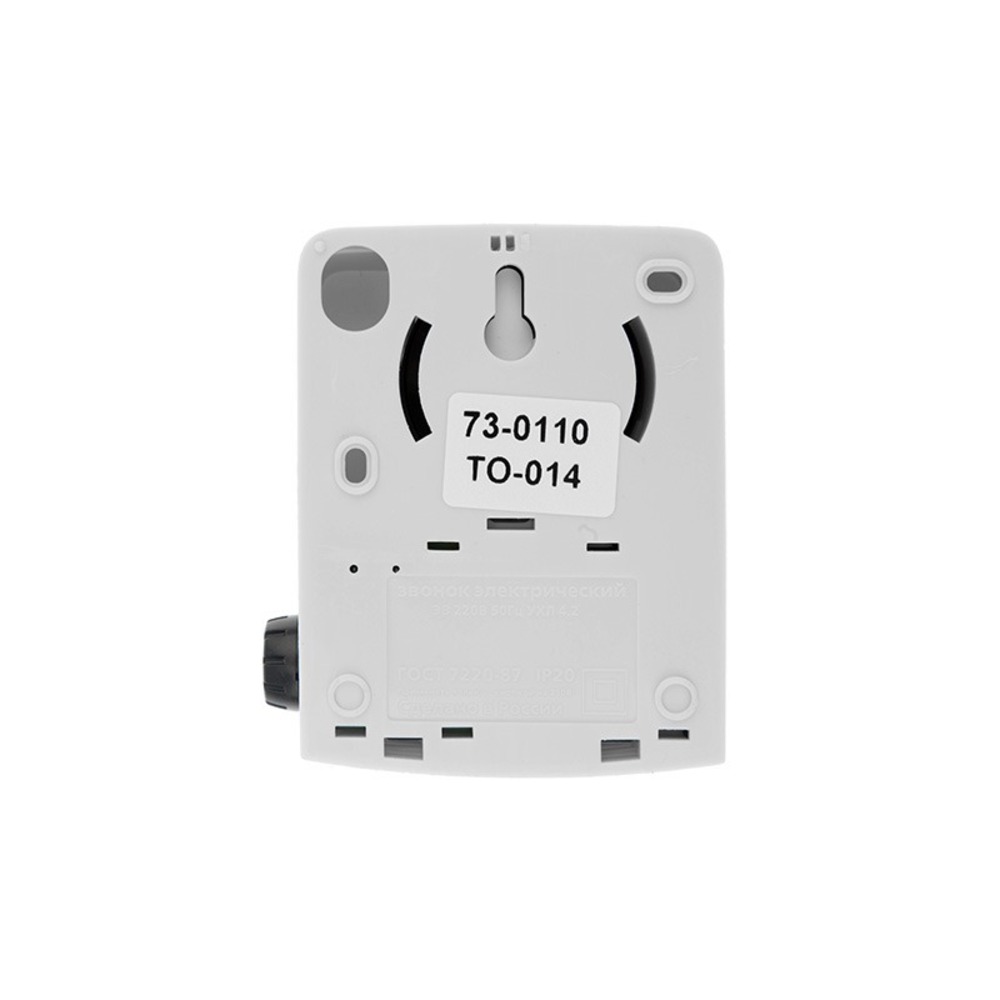 Электрический звонок проводной без кнопки. Сфера применения: Для подачи звукового сигнала в жилых, служебных и общественных помещениях, оснащен регулятором громкости. • Характеристики: • Количество мелодий: 1 • Цвет: Мягкий белый • Номинальное напряжение: 220 В • Материал: ABS-пластик • Степень защиты:IP20 • Ширина: 35мм3 • Высота, 98мм • Длина: 75мм • Масса, 0.083 кг Звучание – электронная трель.